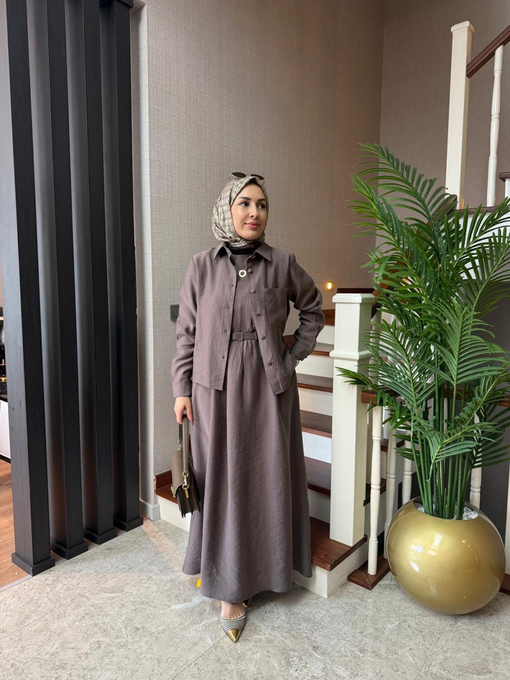 Elbise boy 138 cm’dir, sıfır kollu, arkadan fermuarlı, önünde nervür detayları bulunmaktadır ve kendinden kaplama kemeri mevcuttur.