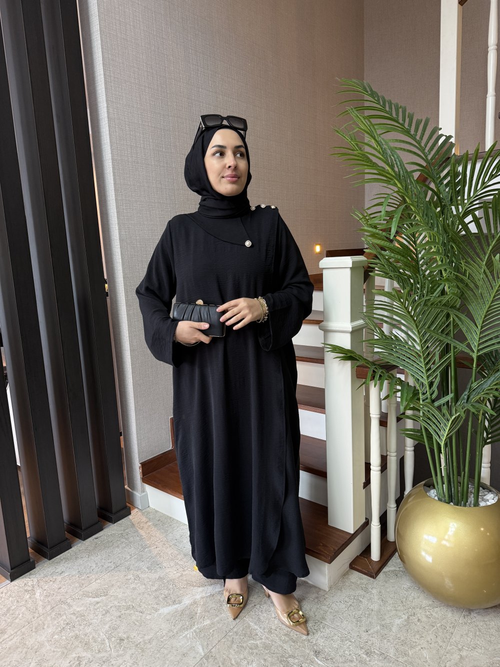 Tunik boy 125 cm’dir. Kruvaze kapama şeklinde gelmektedir, omuzunda düğme detayları mevcuttur.